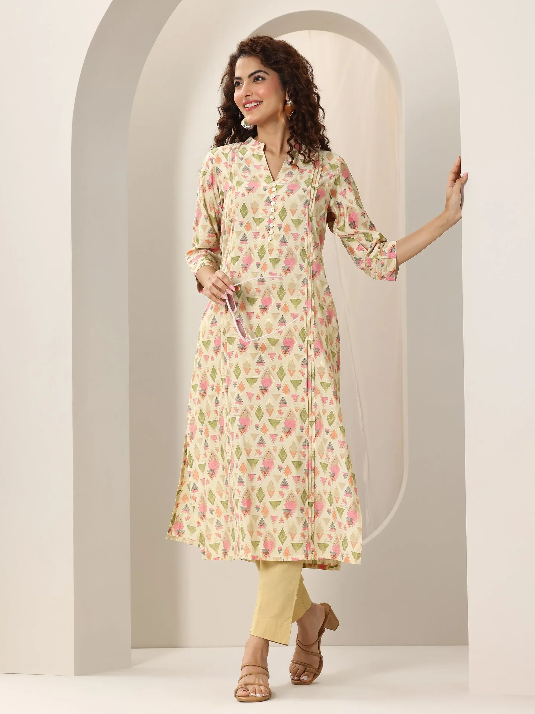 Beige Printed Silk Blend Straight Kurta