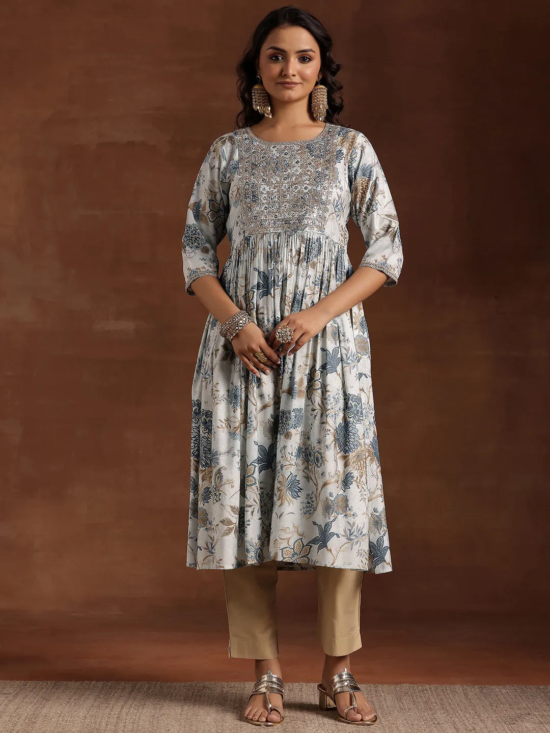 Beige Printed Silk Blend Straight Kurtis