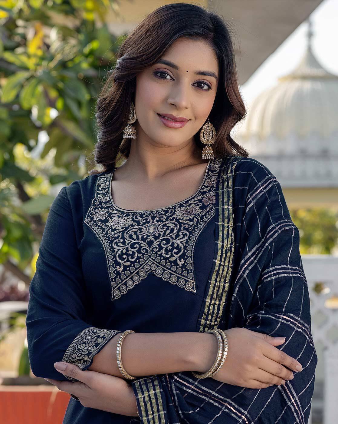 - Crafted with high quality fabric along with precision and adorned with delicate zari woven yoke, this kurta set is lightweight and breathable. The printed neckline and sleeves hem beautifies the kurta. The printed dupatta with tassels and solid pants enhance the look to new heights.
